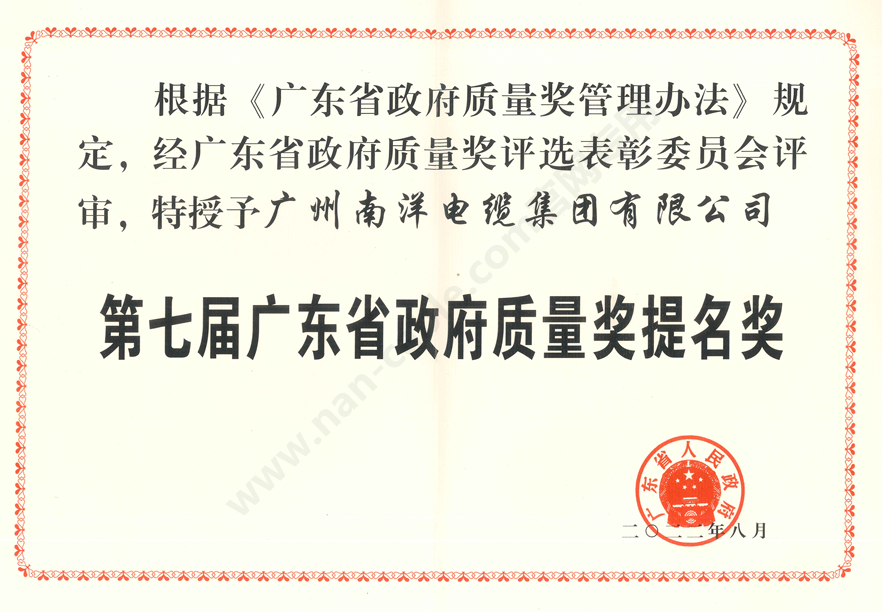 • 第七屆廣東省政府質量提名獎證書